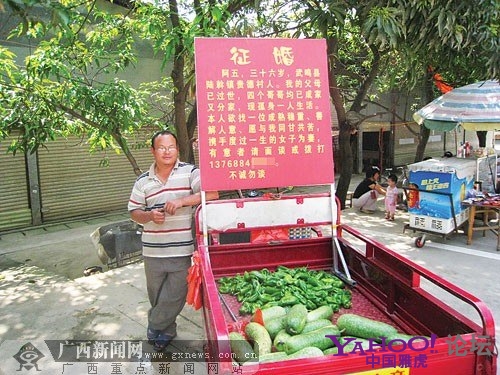 “本人常年征婚,凡年龄满18周岁以上35岁以内的女性,均可应征。要求:身体健康,地区不限,能吃苦耐劳。形象俊美,气质佳优先应征。联系人:卖菜哥。TEL:1368528****。非诚勿扰!”征婚启事是“卖菜哥”用黑色水笔写在纸板上的,“卖菜哥”说他卖菜的地点不固定,每天就带着这个征婚牌在各个菜市场摆摊。