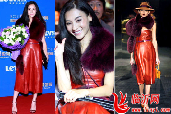 Gucci 2011秋冬系列红色紧身皮裙大气时尚的皮裙造型还是性感的抹胸款,张柏芝这套Gucci造型显瘦又霸气,皮草领的装饰感同样很出色,另类的玫红色调让张柏芝看起来贵气十足也不失个性品味。