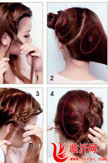step4 顺时针将发辫盘旋在耳根发结处,将发结包裹,用小夹固定。