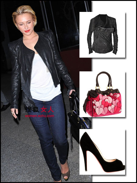 搭配建议:不规则的黑色皮衣显露出不同的个性,不再随波逐流而是鹤立鸡群,搭配露趾的高跟鞋,最好是配上一个花朵包包,才是将春天进行到底。