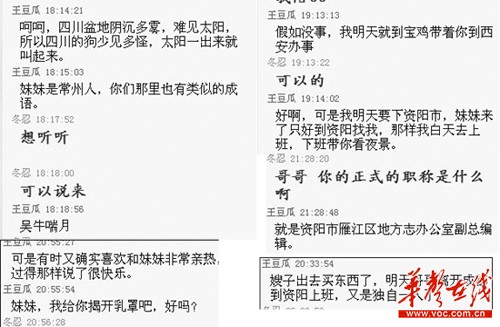 聊天内容透露,“王豆瓜”出任资阳市雁江区地方志办公室副总编辑、中国作家协会会员、中国解放区文学研究会副会长、资阳市文献学会会长等多个职位,并自称出过30本书,且列出多部代表作品。网友“冬忍”则为江苏常州人,目前居住在陕西省宝鸡市。