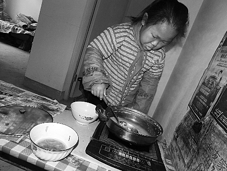 在小铭的家里,记者目睹了这样让人心酸的一幕:菜板上放了点烂白菜叶子,菜叶是她昨天和妈妈从市场上捡来的。小铭熟练地把锅放到电磁炉上,锅里是早晨剩下的小米粥。不够填饱小肚皮,于是她又从水管里接了半碗水倒进锅里。就着小半碗菜汤,她端起饭碗有滋有味喝起来。