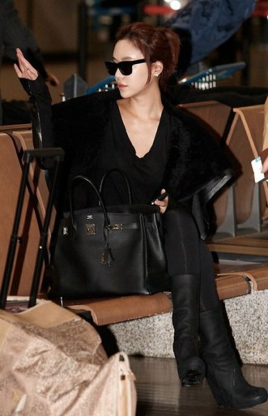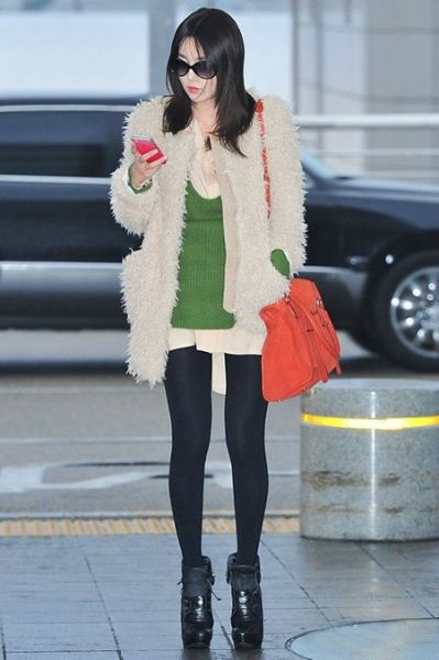 南奎丽一件毛毛外套十分抢眼,黑色的裤袜与厚底靴简洁又利落的休闲装扮,桔红色的包包更是亮点。