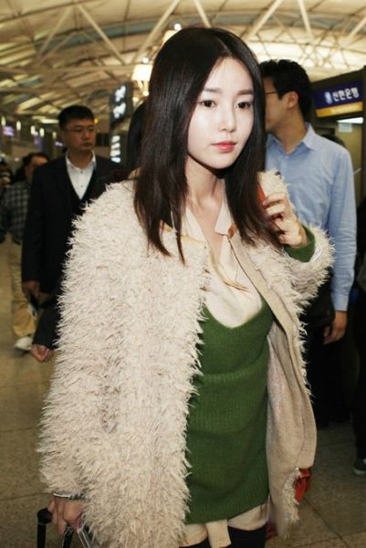米白色毛毛外套内搭丝质衬衫与毛线背心,穿出了层次感。即使是素颜+休闲装扮也让南奎丽足够迷人。