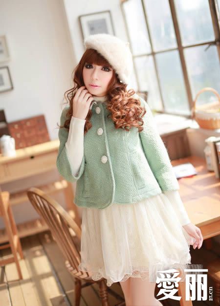 淡绿色的毛呢外套,挺括的面料让衣衣呈现出非常立体的线条,圆润的衣摆造型,呈现出优雅的色彩,简单的短造型,搭配起来非常的干练。