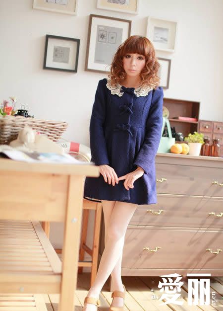 甜美花边领蝴蝶结扣修身毛呢大衣 宝石蓝色彩的修身大衣,鲜明的色彩,呈现出甜美的气息,略带高腰线的剪裁风格,让腰身的造型更加的立体,精美而立体的小蝴蝶结点缀,透露出可爱的俏皮味道呢。