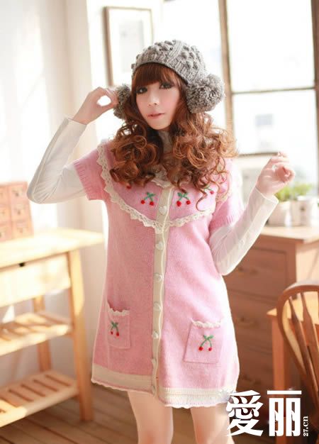 甜美可爱樱桃中长款针织毛衣 淡粉色的长款造型的针织衫,细腻而轻柔的针织面料,穿着起来非常的舒适,淡淡的色彩,散发出非常迷人的浪漫气息,衣身上采用了水果的图案点缀,充满了可爱的俏皮味道。
