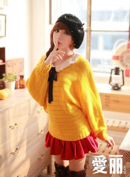 嫩黄色的针织衫,宽松的版型,没有拘束感,轻柔的面料,亲肤的感觉,穿着起来非常的舒适,精美的线条,略带透视的质感,温馨浪漫。