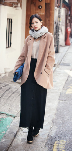 长度到脚踝部分的修身大长裙,优雅复古,大气又优雅。弹性腰部和纽扣开襟的处理,让细节处也很显质感。搭配长款的裸色宽松西装,把时尚单品演绎出新的摩登味道。