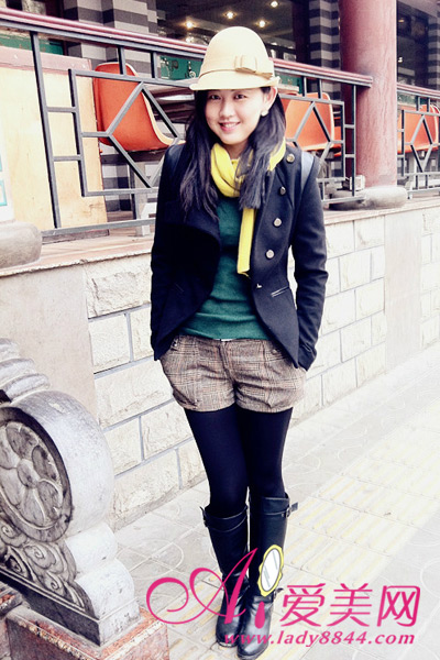 格子呢的短裤搭配上短款小西装和渔夫帽。个性的机车长靴和亮色围巾起到了非常好的点睛效果。