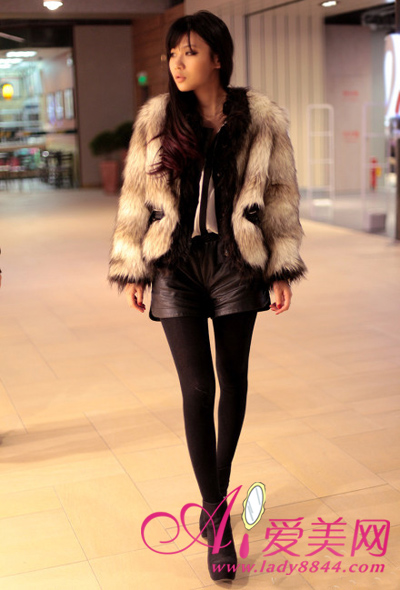 一身的皮草虽然不环保却帅气十足,华贵的皮草外套搭配上小短裤,露出长腿的穿法显高显瘦。