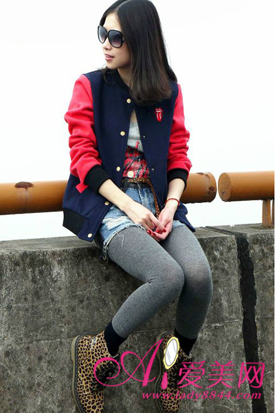 休闲的卫衣外套搭配上牛仔短裤和宽松T恤,休闲的装扮再配上豹纹马丁靴就时尚了起来。