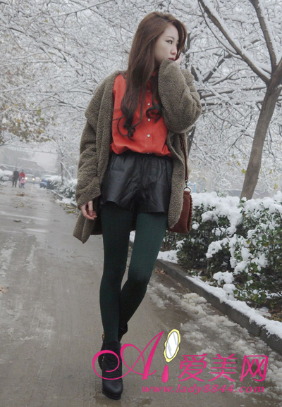 皮质宽松短裤搭配上雪纺衬衫和连裤袜,毛绒绒的大外套保暖又时尚。
