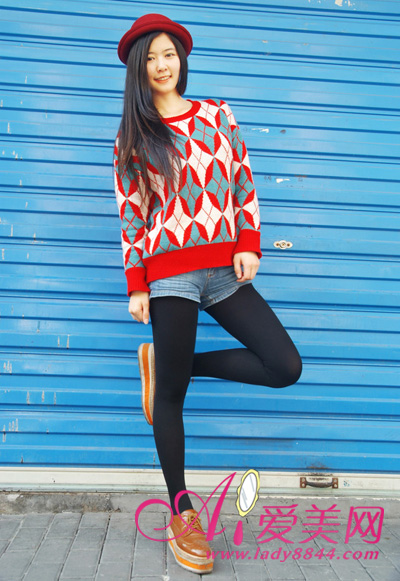 牛仔短裤搭配上复古套头毛衣和时尚厚底鞋,引流潮流。