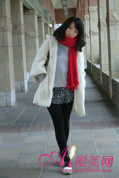 时尚的简约风格,搭配彩色围巾起点睛作用,抢眼的豹纹毛毛裤搭配雪白色大衣干净简洁,鞋子上的豹纹图案和裤子相互照应。