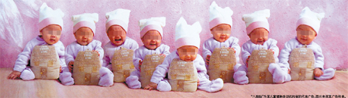 在八胞胎满百日的时候,他们还替一个儿童摄影连锁机构做了代言广告。该摄影机构的李姓总监昨日接受本报记者采访时表示,去年底与家长谈妥代言广告事宜后,由他带队去到家里拍摄,“平时我们拍1个BB需要两个人,那一天有十几个人在协助,家长及保姆也全动员起来”。他说,当时场面非常混乱,“有的BB很困,有的在哭,有的到处爬,需要不断调整他们的状态”,结果是折腾了整整一个下午,才拍出十几张毛片,“只选出一两张好的”。这一两张合照被这个连锁机构高调称之为“中国首例八胞胎”,作为广告传单,大范围向客户派送。