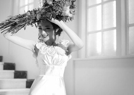 1、婚礼上中长发发型是新娘的时尚款式,刘海加卷度,看起来更有型,并且完美的修饰新娘的脸颊,让您完美的制造出完美鹅蛋脸,打造韩剧完美新娘。