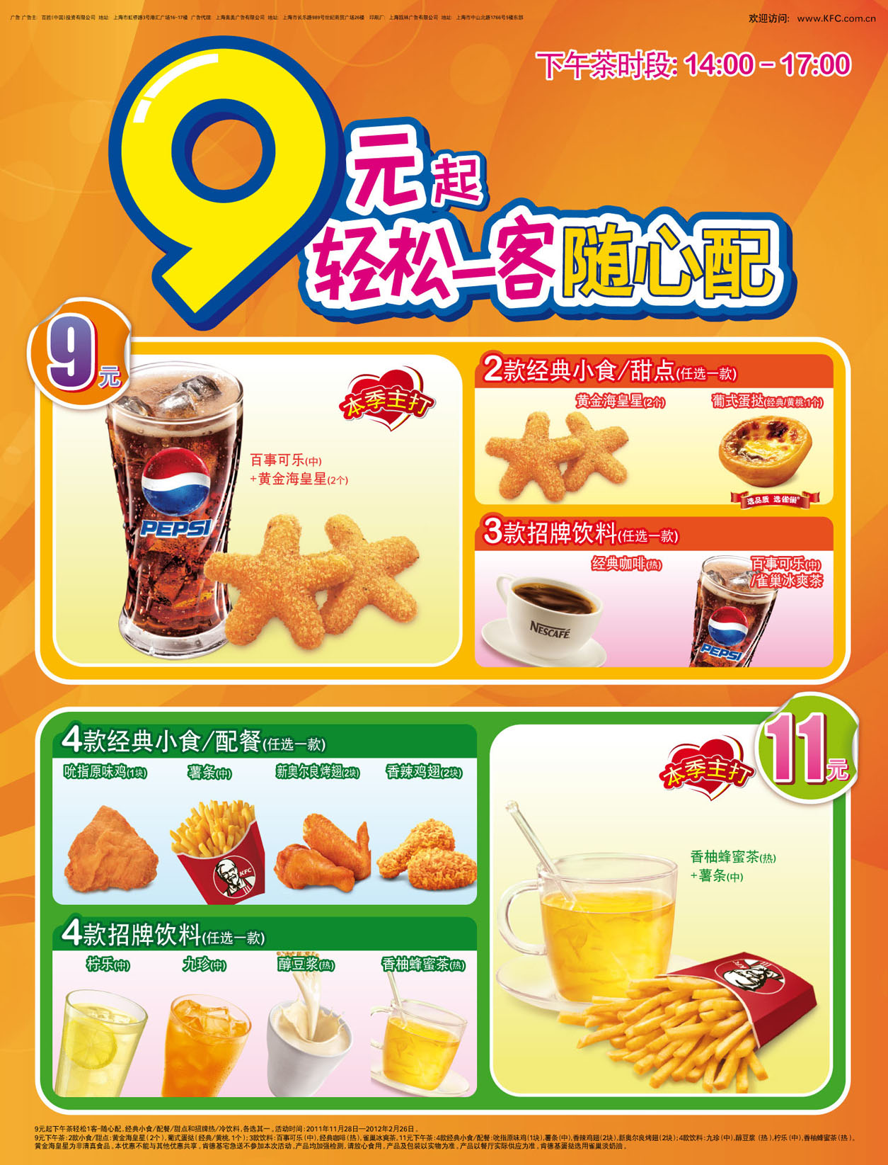 11元下午茶:4款经典小食/配餐:吮指原味鸡(1块),薯条(中),香辣鸡翅(2块),新奥尔良烤翅(2块);4款饮料:九珍(中),醇豆浆(热),柠乐(中),香柚蜂蜜茶(热)。