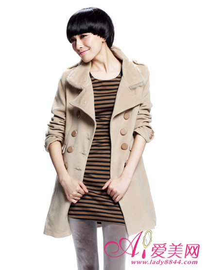 裸色的双排扣毛呢大衣,加绒的边边看起来更加粉嫩粉嫩的感觉!