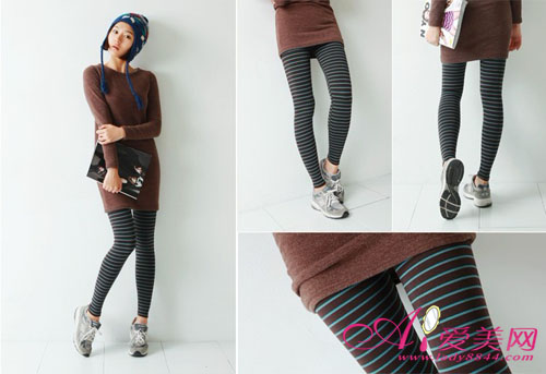 打底裤也有横条纹。一件加长毛衣、一双运动鞋和低调而华丽的横条纹展现的特有气质非常搭是游玩、逛街的最佳搭配。