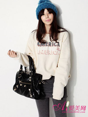 大T恤、小短裙和打底裤,永远的三个好伙伴。可爱的蓝色针织帽和黑色皮包,迅速成为街拍焦点。