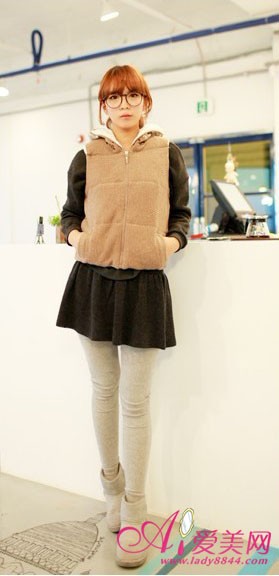 即使是冬天,也不能放弃小摆裙。穿上一条浅色打底裤,保暖问题立马搞定。褐色的棉马甲,给了小摆裙更多的活力。