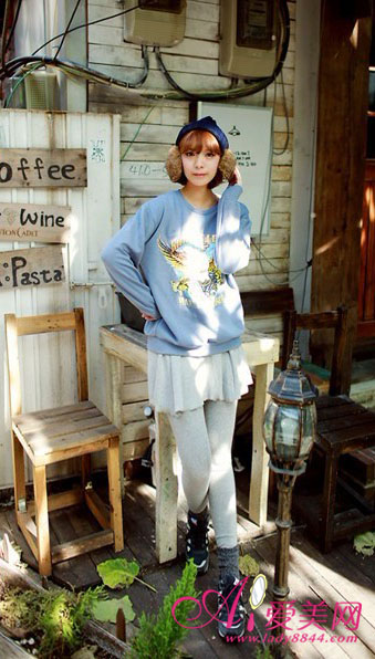 新出单品—带裙子的打底裤,也能搭运动鞋。上身穿上一件宽大的T恤,耳套和针织帽,保暖又时尚,更是可爱和活力并存。