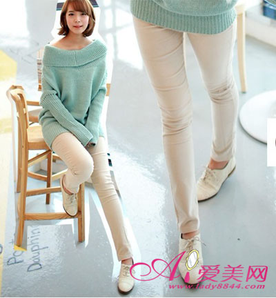 打底裤也能穿出OL风。一字领淡绿色粗毛衣,白色的打底裤和小皮鞋,演绎出轻熟女的优雅和活泼。