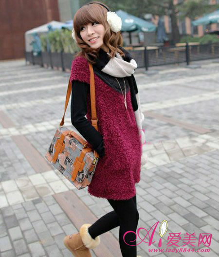 黑色打底裤搭配雪地靴,经典时尚。红色连衣裙和黑色的裤子碰撞出不一样的甜美。白色耳套来带整体的和谐。