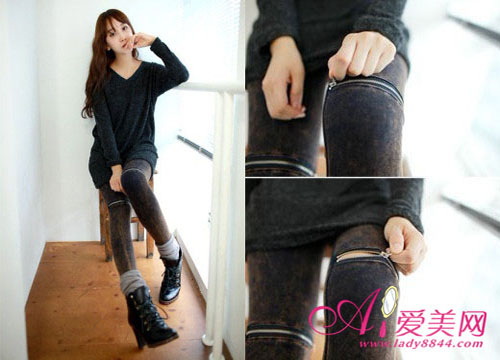 推荐搭配:膝盖拉链打底裤 + 黑色高帮短鞋 + 黑色毛衣