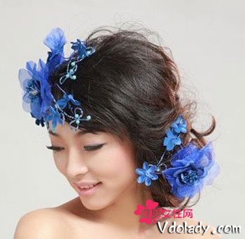 宝蓝色花朵和珠链发饰点缀在发侧和盘发上,高贵迷人。