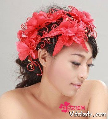 大红色叶片花朵发饰点缀在新娘低盘发上,温婉浪漫。