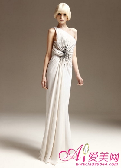 白色不对称婚纱裙,腰部的设计个性时尚,简洁中透显奢华魅力。