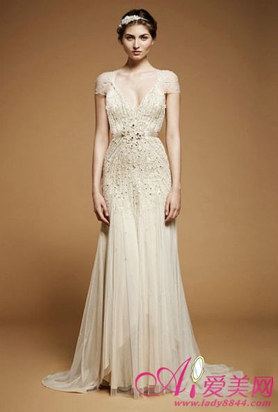 米黄色的镶钻婚纱,很有宫庭感,高腰与大V领更显性感迷人。