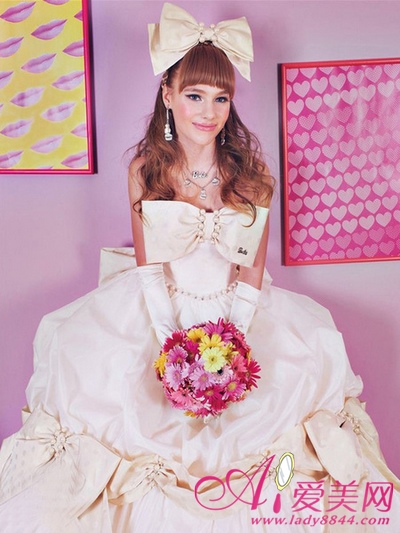 大蝴蝶装饰的蓬蓬婚纱裙,让新娘有甜美的公主气息,长筒手套是婚纱的必搭单品。