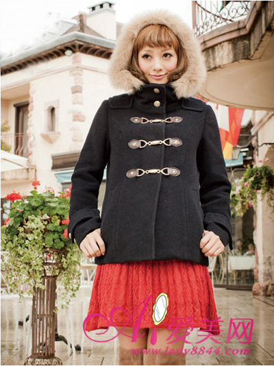 黑色改良版牛角扣短外套,搭配红色针织短裙很有学院风味道,帽檐皮草看起来就很温暖。