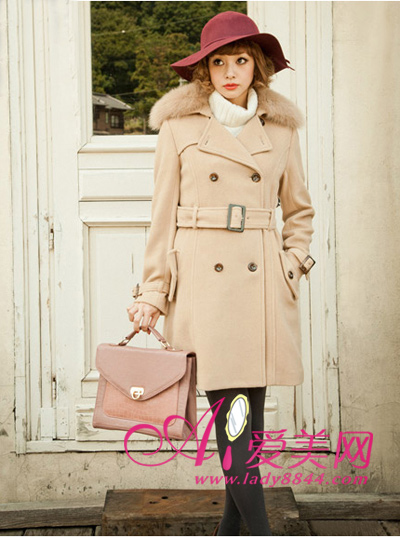 驼色双排扣大衣,剪裁贴身将身材比例勾勒的更加完美,领部的浅色皮草毛领给人甜美的感觉。