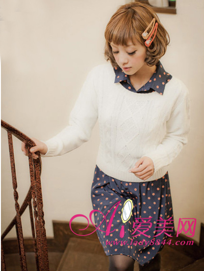 复古白色套头毛衣内搭蓝色波点连衣裙,不同材质的碰撞相似的怀旧风格会带给你不同的时尚灵感。