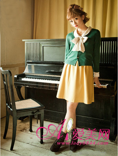 绿色搭配流行的黄色,清新优雅,用胸前带有飘带的雪纺衬衫来做内搭再合适不过了,复古氛围满点。
