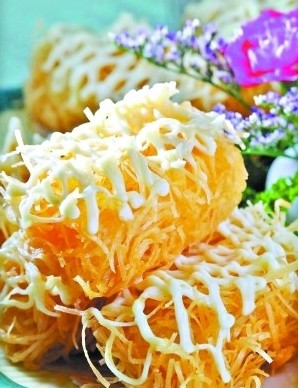 身披米白外衣,长条的身躯被一层网状的外套裹得密不透风,乍一看,还以为是日系的天妇罗。咬上一口才知道,原来香脆的新潮外表下藏着的竟是软绵的传统茶点——萝卜糕!位于中海名都会所内的海明阁酒家中的这道脆皮萝卜糕包裹着腊味、虾米、冬菇的细滑萝卜糕配上外层加入了芥辣的脆皮,口感十分混搭,再加上表面厚厚的一层沙拉酱,将芥辣带来的刺激味道中和得恰到好处。无独有偶,南南州路上的恒顺广府酒家那款酥皮紫薯粑,今冬穿的新衣和脆皮萝卜糕有几分相似,不过,一箸划开却是清甜紫色番薯。