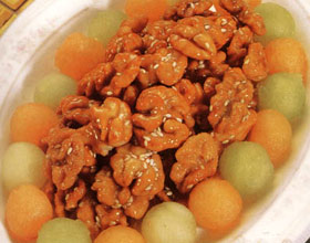 3.锅内放入糖和50克水,在小火上收汁,用锅铲不停地铲动,待糖汁翻大泡后(翻鱼眼泡时),端离火位,下入桃仁随即铲动,待糖汁全部裹在桃仁下,即摊开晾凉,装盘即成。