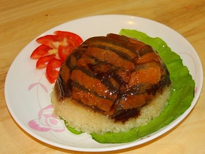 (4)用原锅,留少许油,下夹沙肉,加糖,淋上熟猪油翻几下出锅即成。