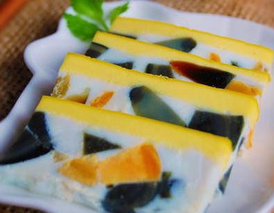 1、皮蛋、咸蛋各切成小丁,三色蛋成品(19张)打入鸡蛋白,再加入调味料拌匀,倒入铺有三色蒸蛋玻璃纸的模型中,放进蒸具中蒸9分熟(约7分钟)。皮蛋剥壳,切小粒。咸蛋黄切小粒。鸡蛋液加少许盐及黄酒,轻轻地搅匀,要轻轻地打散,不要打起泡或打发,以免蒸制后蛋糕体中间有气泡空洞,不美观。将皮蛋、咸蛋粒加入鸡蛋液中,混合均匀。 取一个铁盒或铝制(传热快、耐热)的金属模子,小心地往里铺上一层锡纸,紧贴着模壁,刮平整,将混合蛋液倒入。