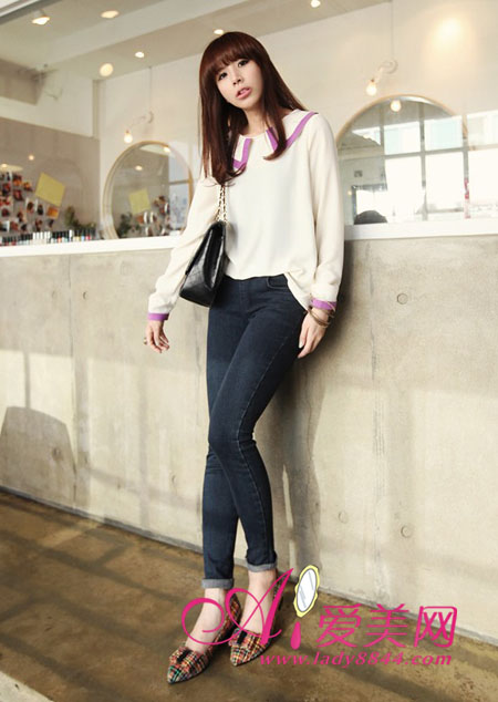 洗水泛白的紧身小腿裤,硬朗的面料,稍微有肉肉的MM也可以选择哦,能帮你藏起嘟嘟肉。