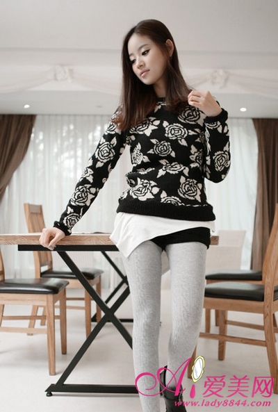 灰色扭花织法打底衫,搭配呢料格子包身裙,很显淑女味。