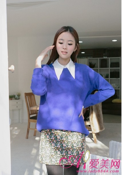 蓝色简洁打底衫,内搭白衬衫,清爽靓丽,下装搭配碎花裙,甜美可爱。