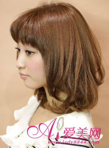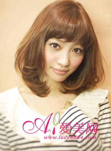 刚到颈部的中长梨花头除了小脸还能修颈,卷发内外交合更唯美,搭配厚重的齐刘海打造一流小脸发型。