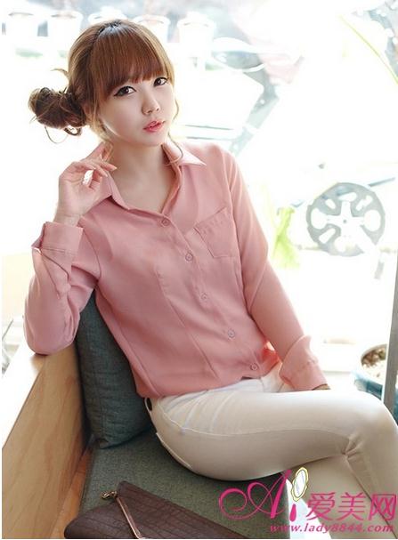 柔粉色雪纺衬衫,款式简洁、版型舒适,搭配紧身裤尽显时尚休闲味。