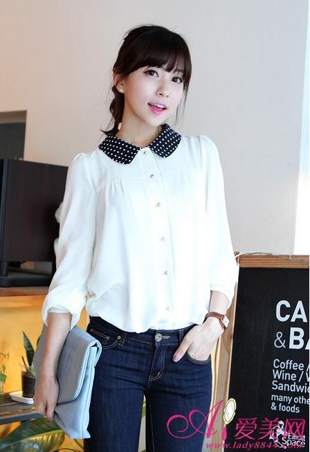 白色衬衫配上波点的小娃娃领,更显清新活泼,简洁利落。