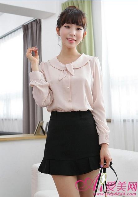 柔粉色雪纺衬衫,个性的领部设计很显女性气质,搭配小黑裙时尚可爱。